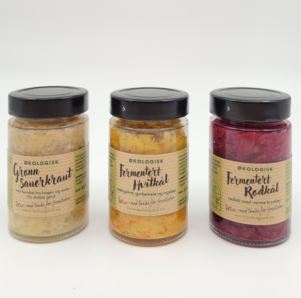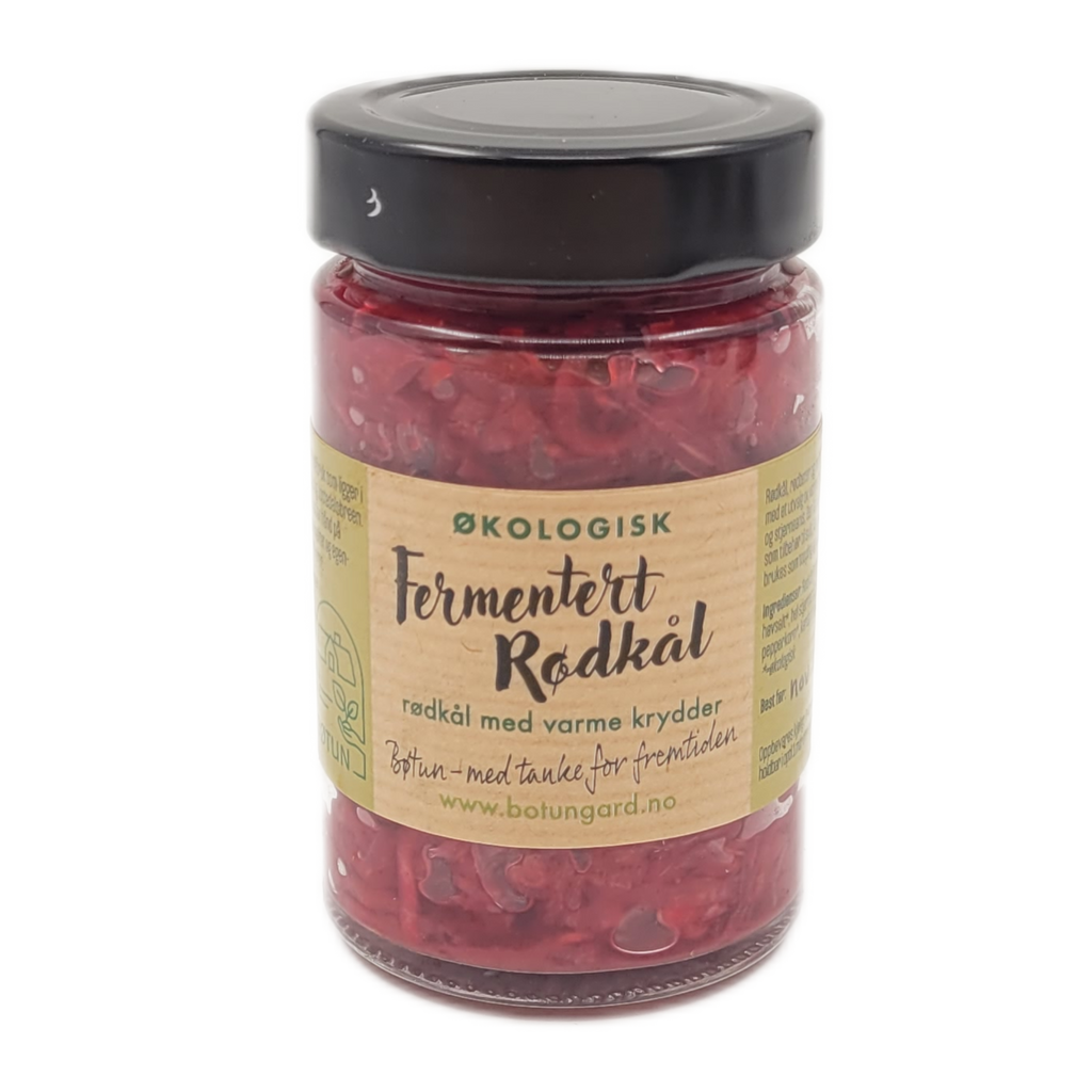 Fermentert rødkål er laget med en smakfull blanding av rødkål, rødbeter og rødløk fra hagen. Disse er nøye fermentert med et utvalg av varme krydder som nellik, kanel og stjerneanis, som gir en kompleks og aromatisk dybde til kålen. Denne fermenterte rødkålen er perfekt som et smakfullt tilbehør til svinekjøtt, kan tilføre ekstra liv til salater, eller brukes som en krydret topping og pålegg på brødskiven.