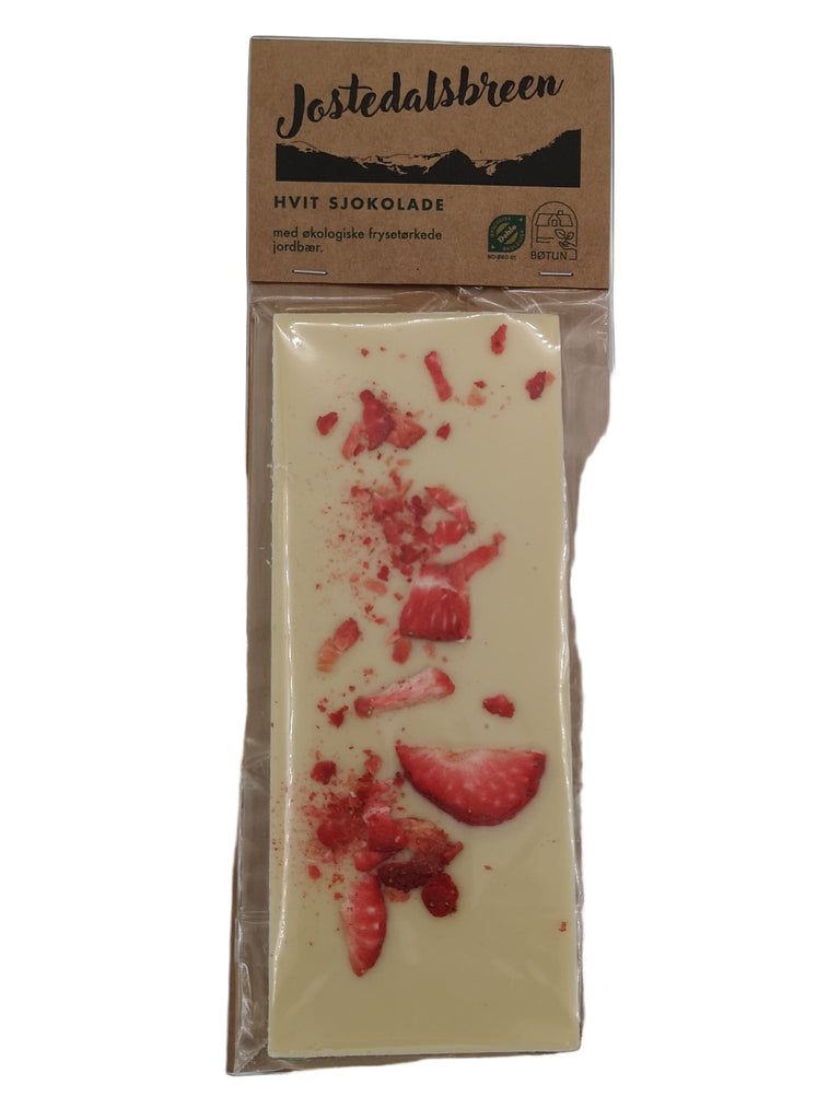 Jostedalsbreen sjokoladeplate er en hvit sjokoladebar med økologisk frysetørket jordbær fra vår egen hage.