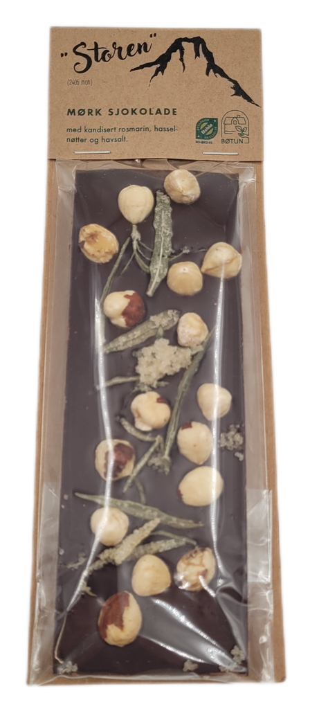 "Storen" sjokoladeplate er en mørk sjokolade med kandisert rosmarin, hasselnøtter og havsalt.