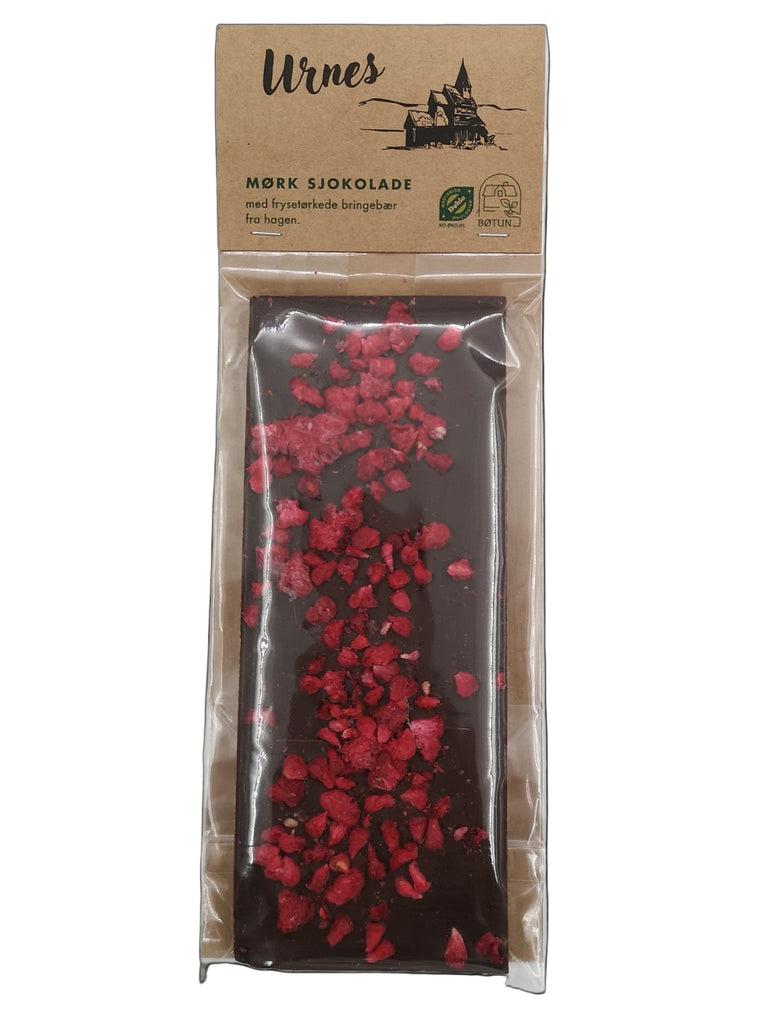 Urnes sjokoladeplate er en mørk sjokoladebar med frysetørket bringebær fra hagen.
