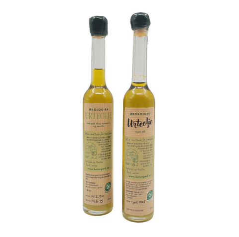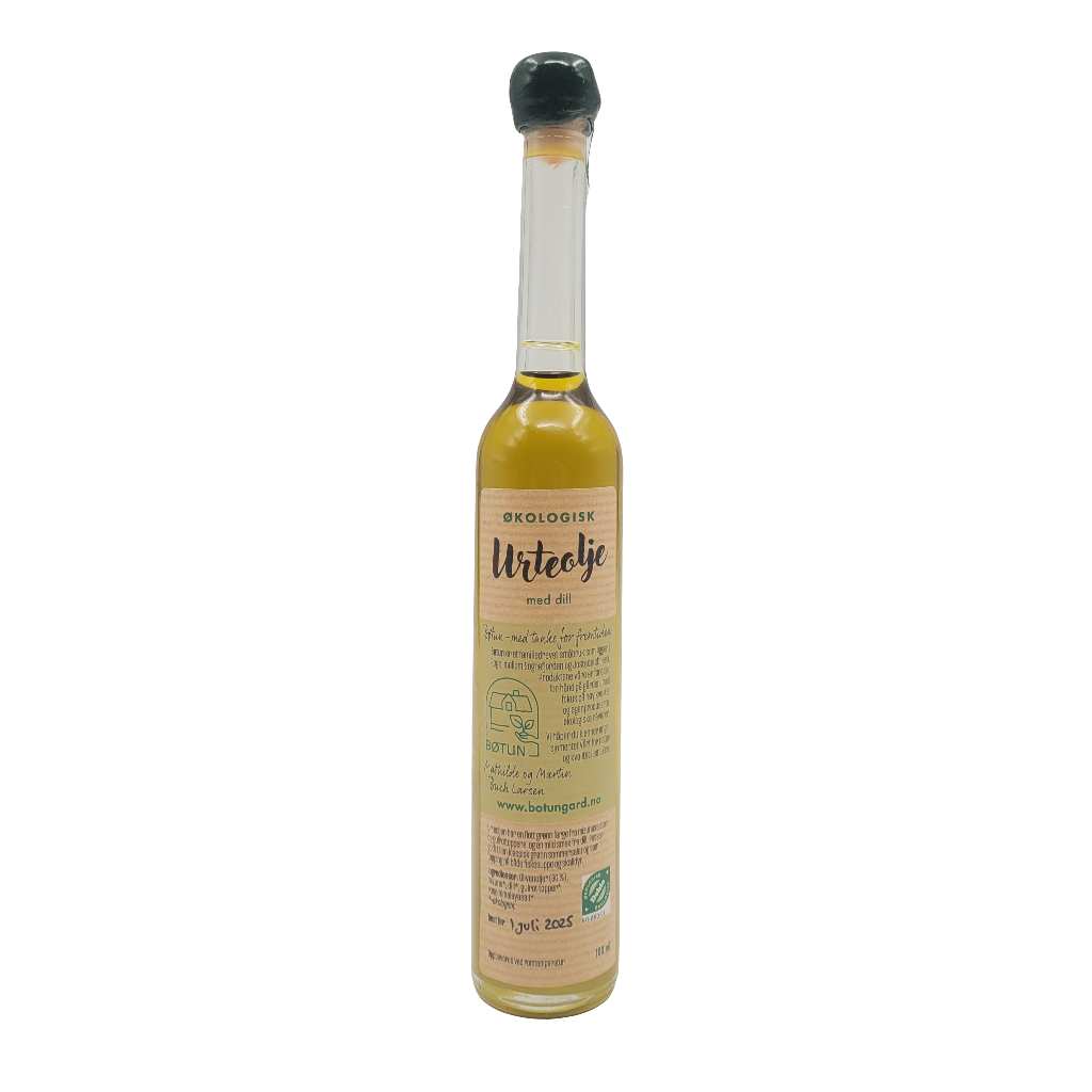 Urteoljen med dill har en vakker grønn farge fra mizunasalaten og gulrottoppene, og en mild, frisk smak av dill. Denne oljen er perfekt til å heve smaken på en klassisk grønn salat, og fungerer også utmerket som topping på både fiskesuppe og skalldyr.