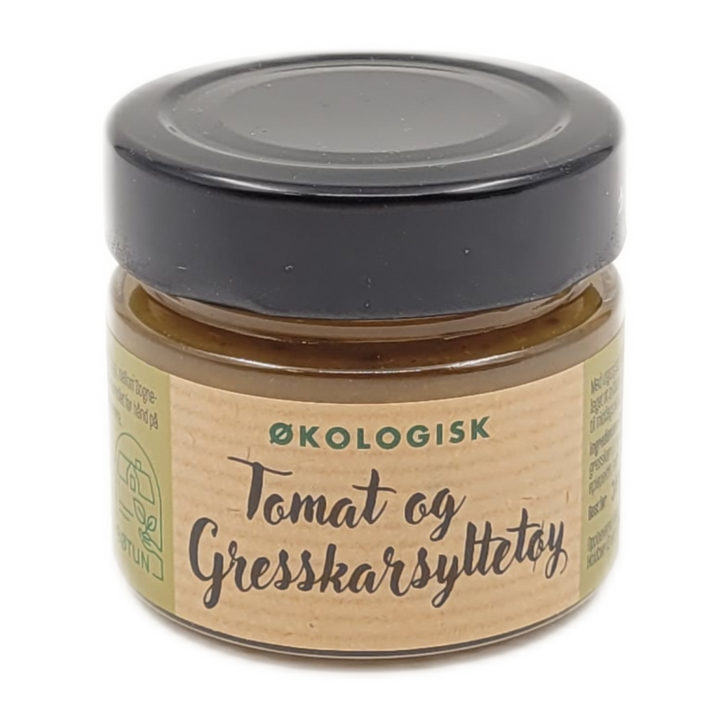 Ingredienser: Grønne tomater(44 %)*, løk*, rørsukker*, gresskar(11 %)*, epleeddik*, sennepsfrø*, karri*, eplepektin*, salt*, *=økologisk