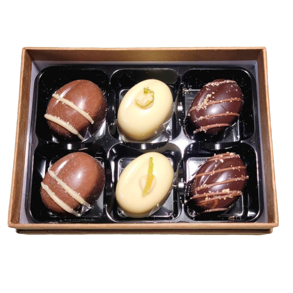Mørk sjokolade pyntet med ristet hasselnøtt. Bak skallet av mørk sjokolade finner du en kremet ganache med lys sjokolade som vi har smaksatt med rosmarin fra hagen. Ganachen innkapsler en hasselnøtt som vi har ristet lett for ekstra sprøhet.